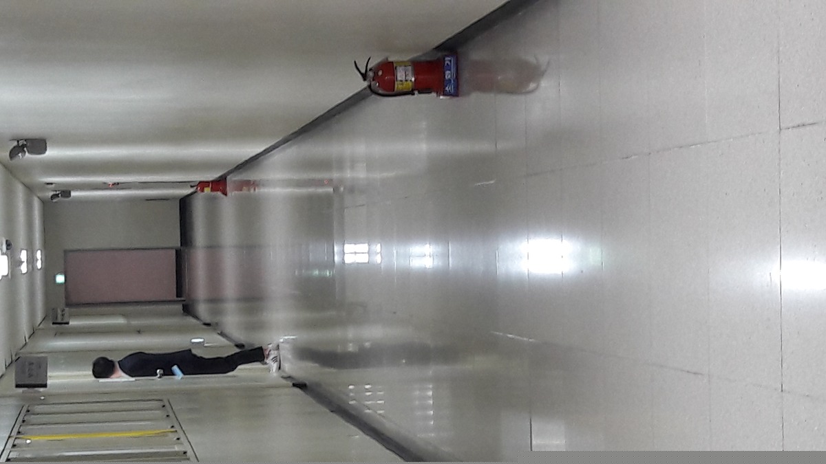 소화기의 보관위치가 복도 땅에 놓여져있어서 복도를 다닐때 걸려넘어질 위험성이 있다.