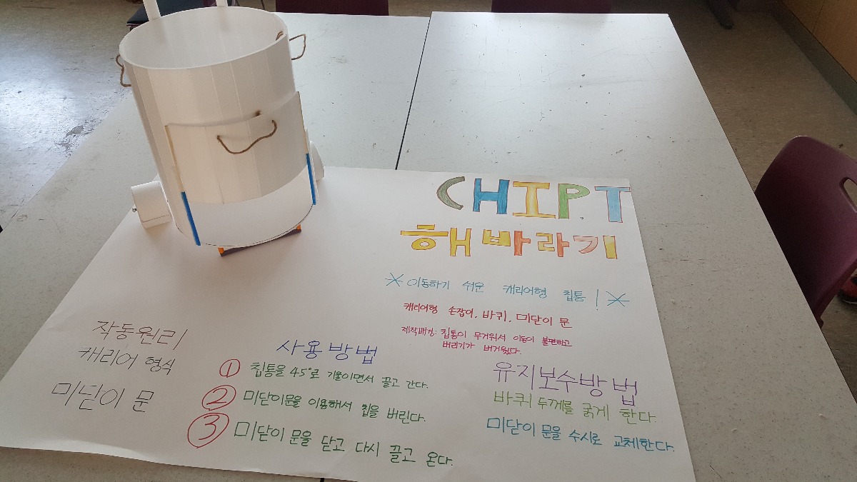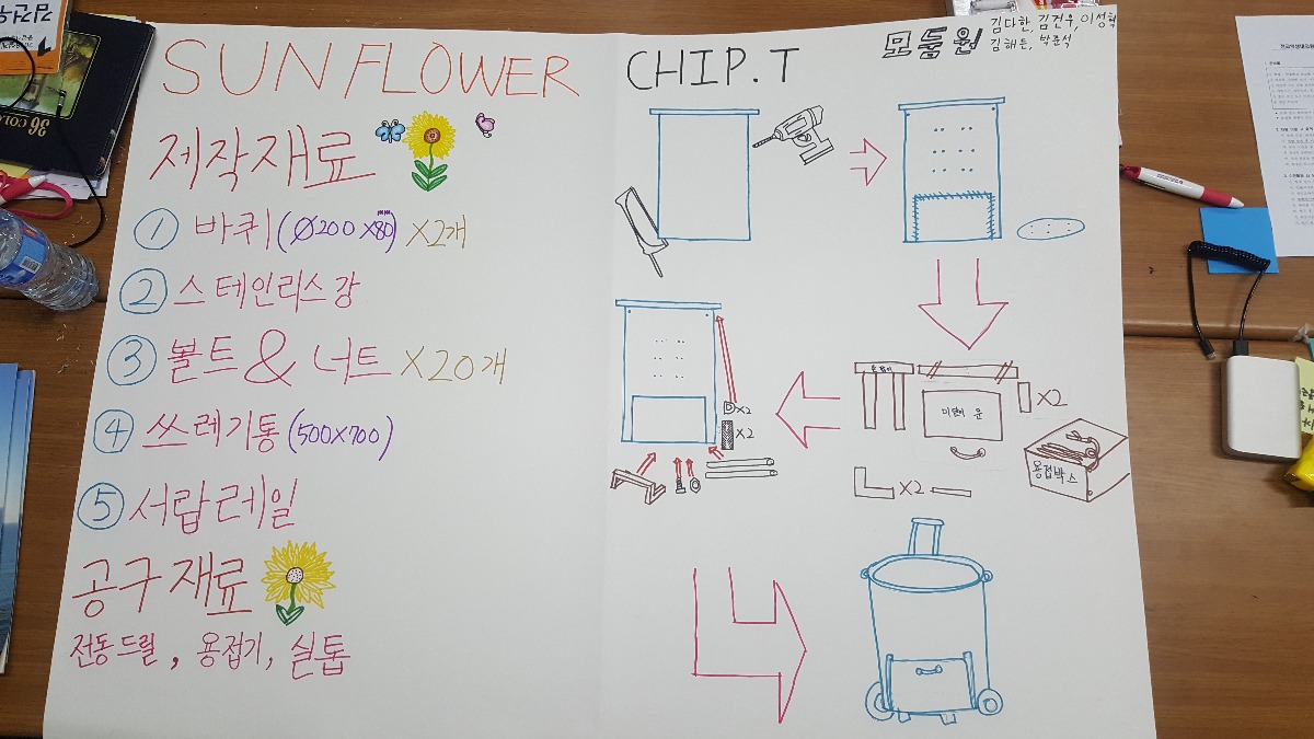 둥근 손잡이와 바퀴를 달아 기존의 불편했던 이동법을 편리하게 만든다, 추가로 밑쪽에 미닫이 문을 달아 칩을 쉽게 비운다