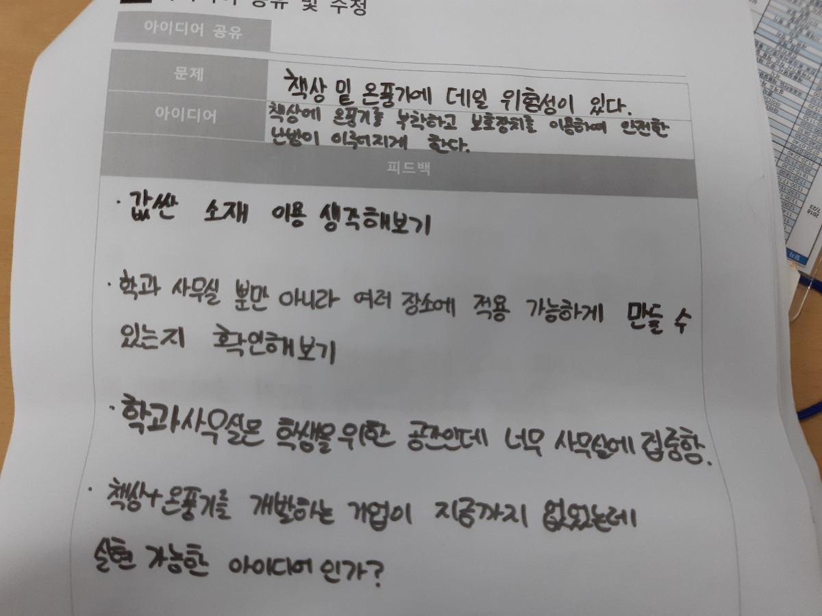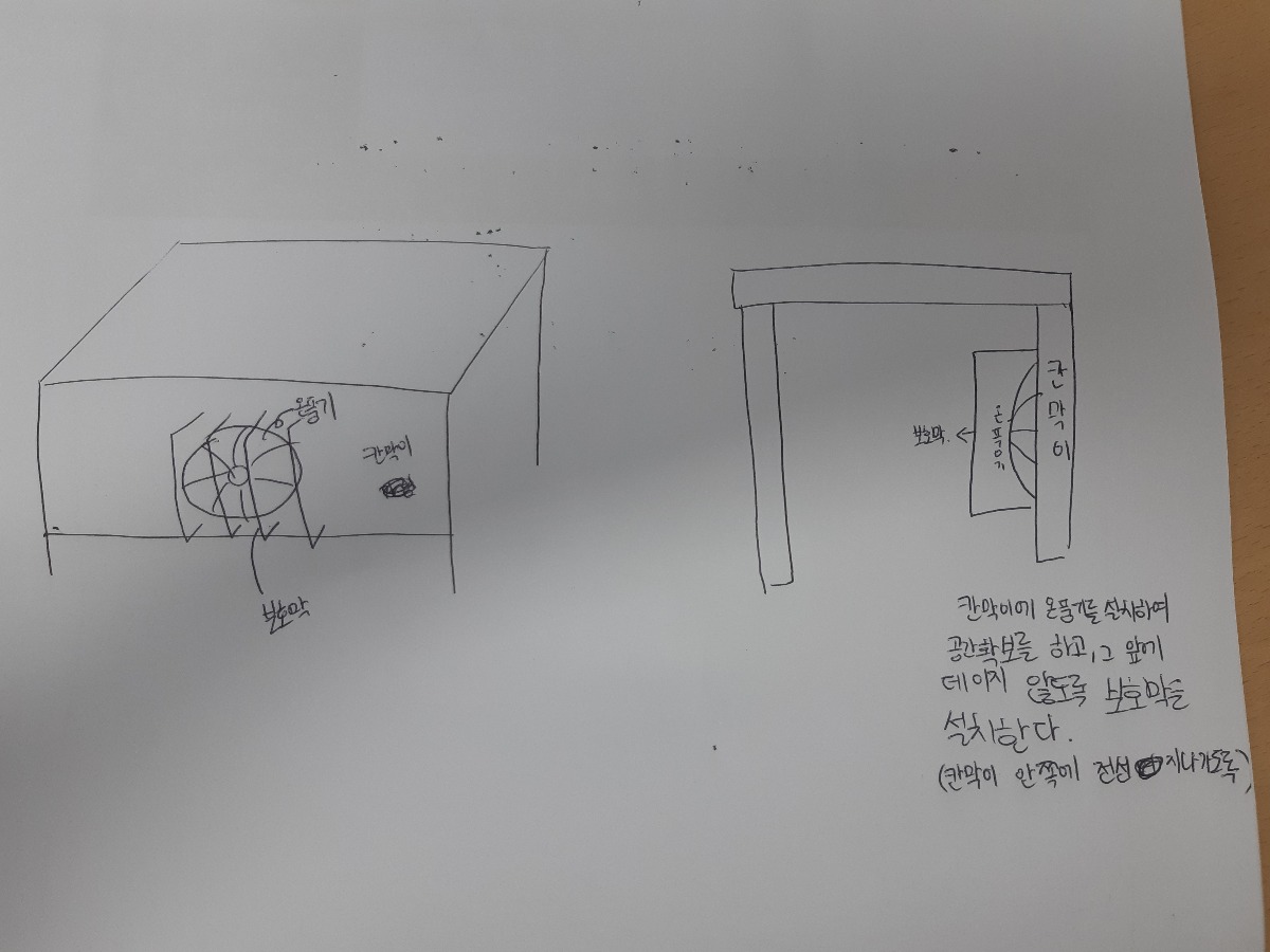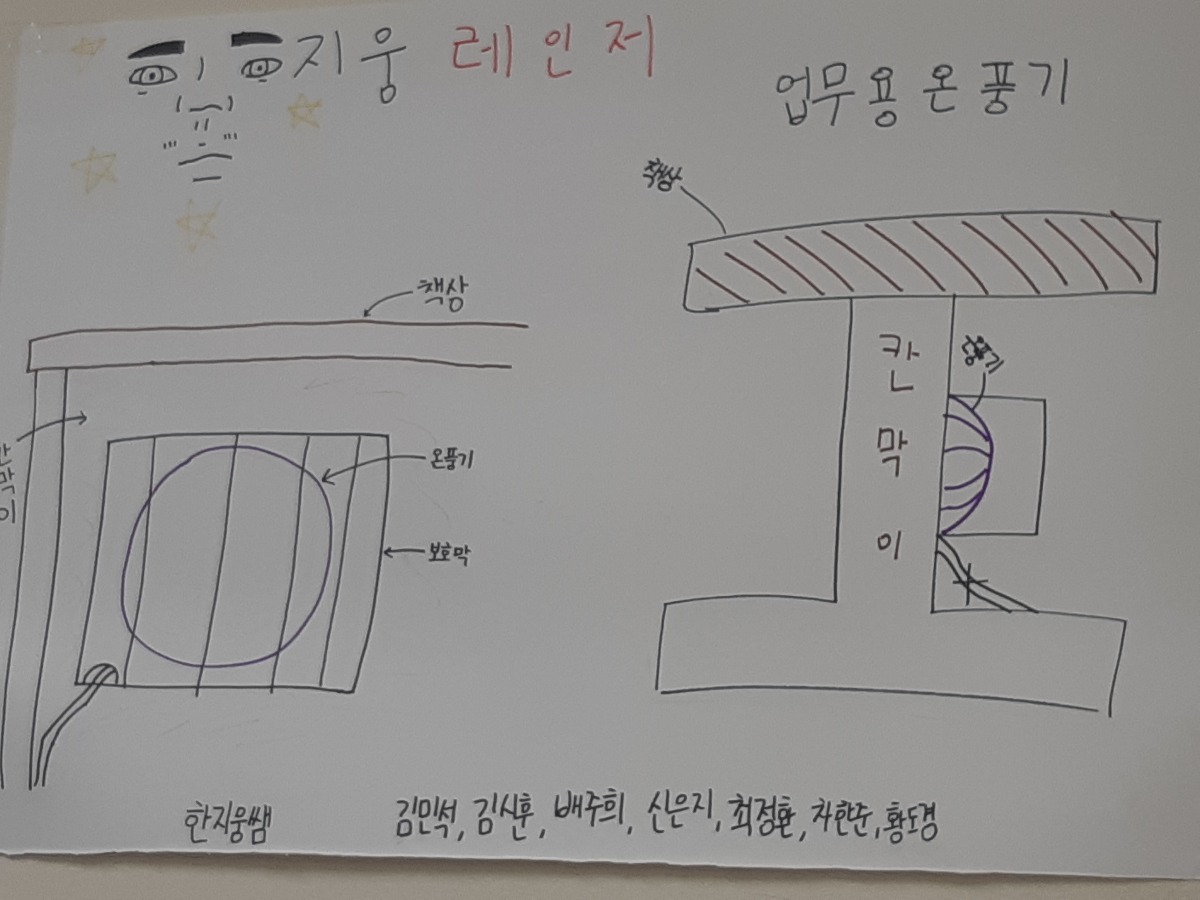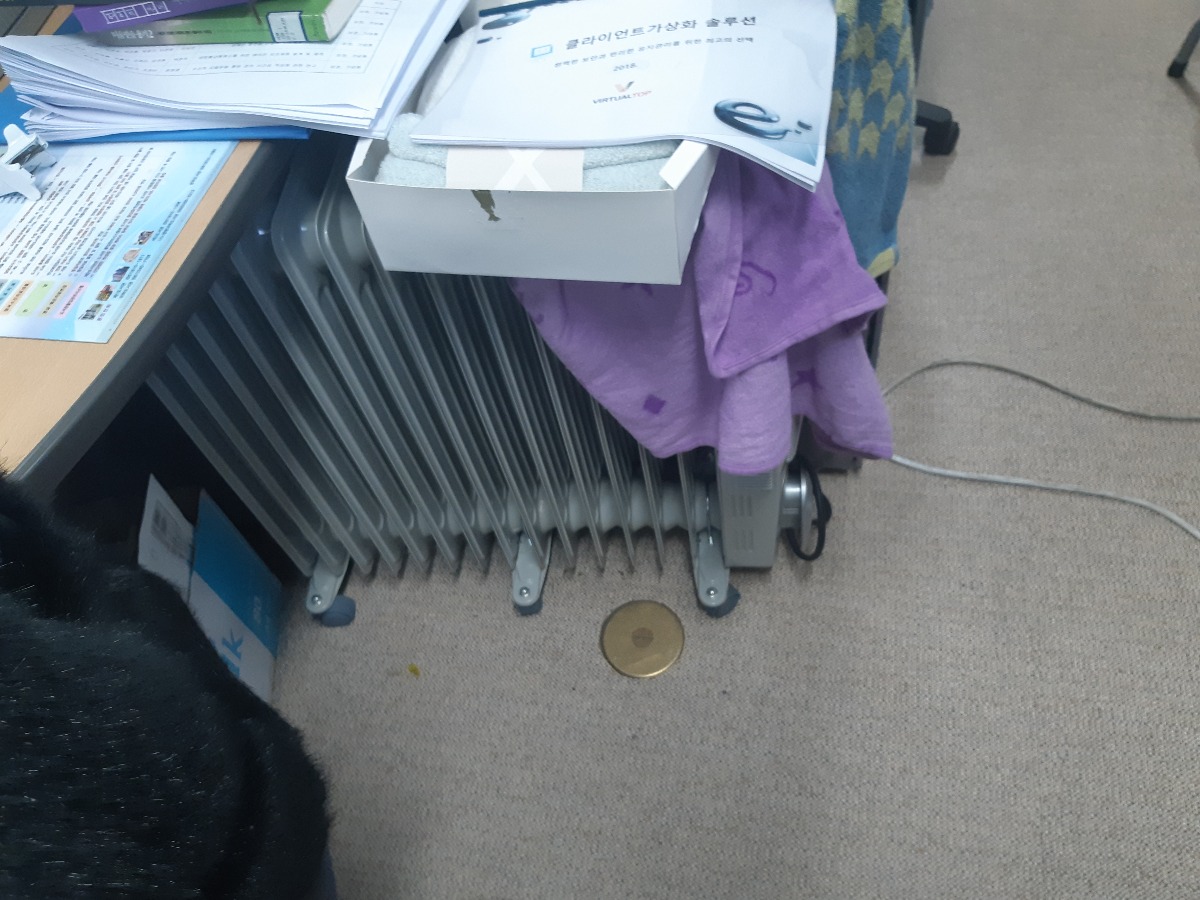 난방이 잘 되지않아 각자 자리에 온풍기가 하나씩 위치해있는데 보이지않아 발아 데일 위험이 있다.